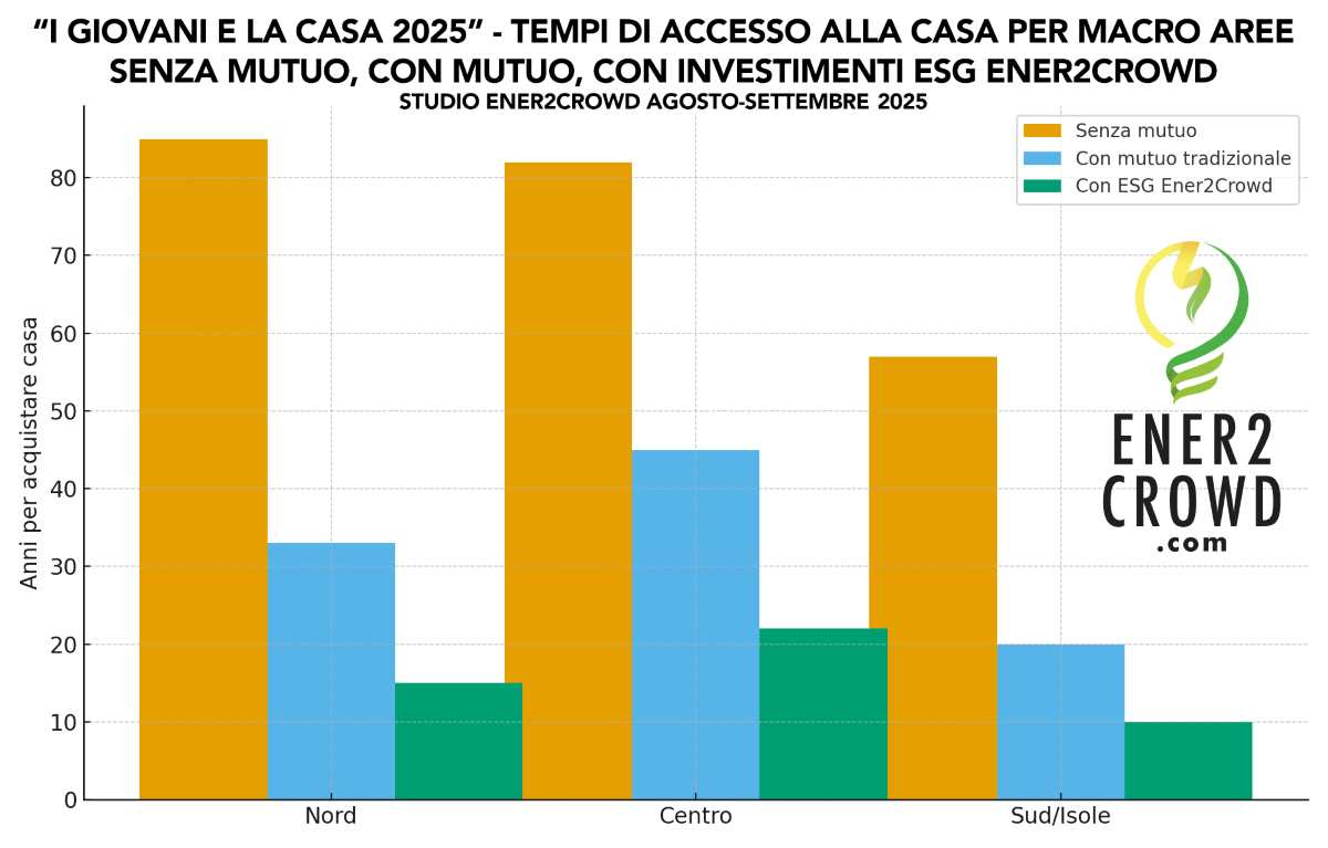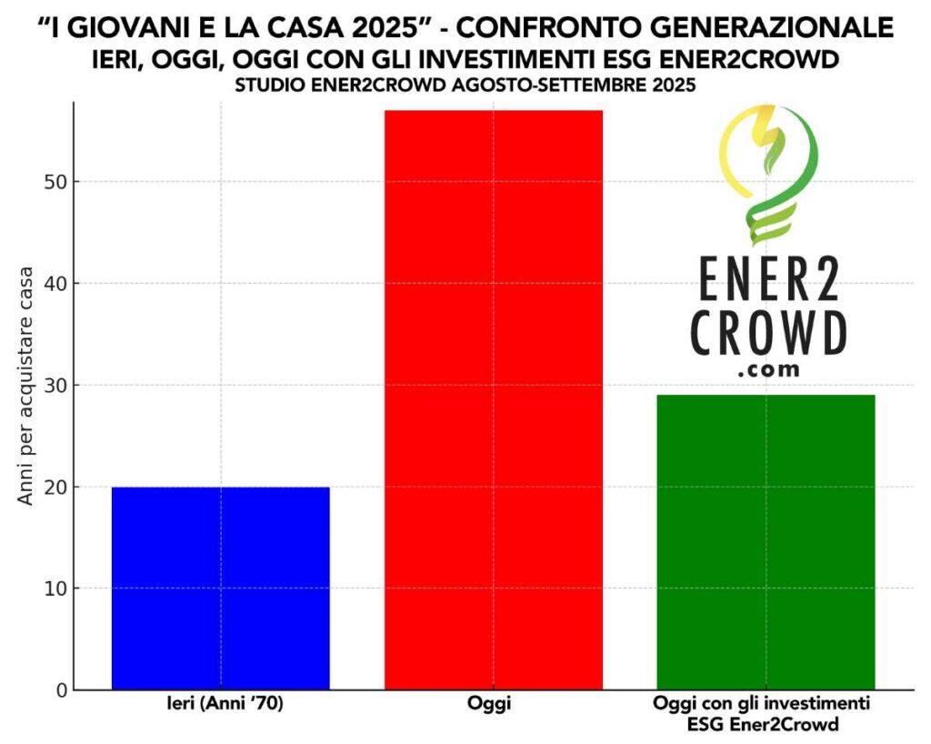 Senza la “scorciatoia” verde del crowdinvesting ESG, comprare casa resta un sogno: per la generazione under 40 è diventato un percorso a ostacoli che spesso dura più di una vita intera. Secondo lo studio “I giovani e la casa 2025” condotto da Ener2Crowd, la piattaforma e app numero uno in Italia per gli investimenti ESG, oggi servono mediamente oltre 57 anni di risparmi per mettere insieme l’anticipo necessario ad accedere a un mutuo.