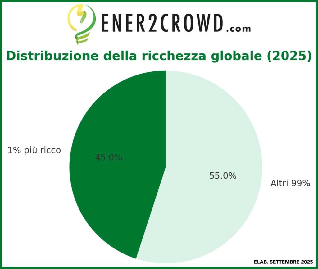 A livello globale —osserva Ener2Crowd— il patrimonio complessivo dei miliardari ha avuto un incremento del +138% dal 2015 al 2025, passando da 6.300 a 15 mila miliardi. Ma è solol’1% più ricco della popolazione mondiale a detenere il 45% della ricchezza totale.