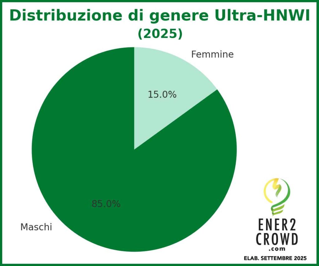 In quanto alla demografia, l’85% degli ultra ricchi è di sesso maschile, mentre solo il 15% è di sesso femminile, con un’età media di 62 anni per gli uomini e di 50 anni per le donne. «E tra gli ultra-HNWI italiani ci sono anche 2.200 italiani che superano i 100 milioni di euro» aggiungono gli analisti di Ener2Crowd, che tra i nostri connazionali registrano anche 67 miliardari su un totale mondiale di 2.400.