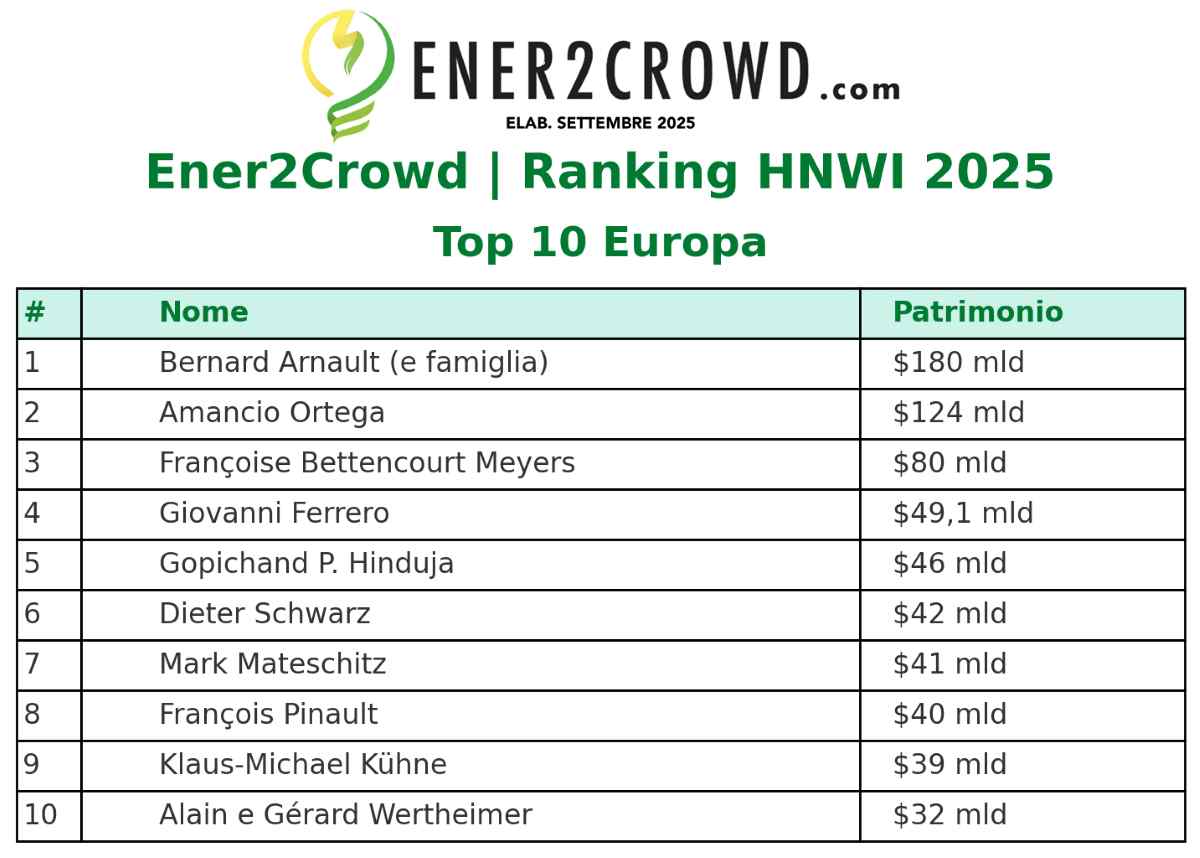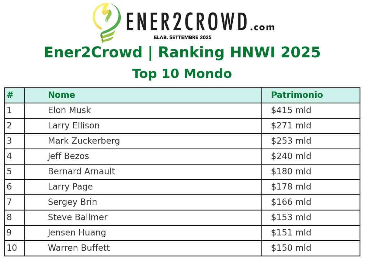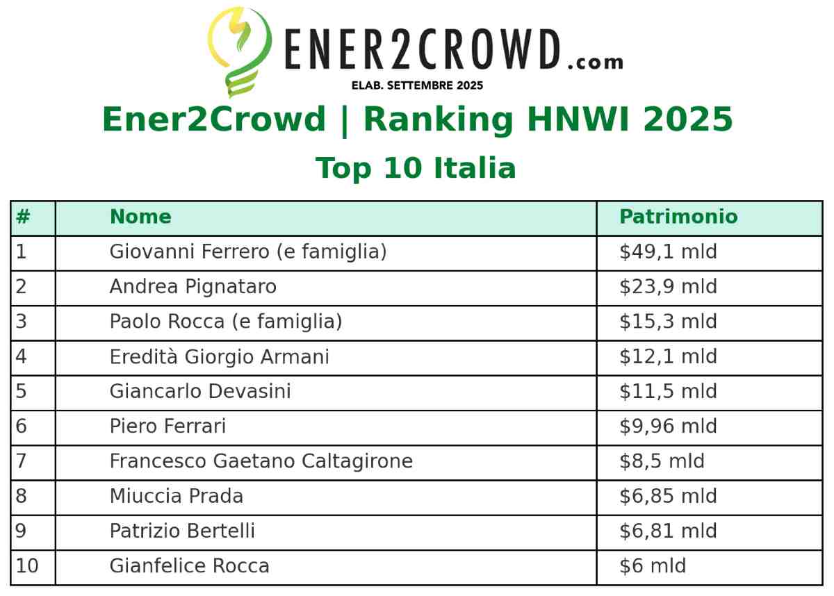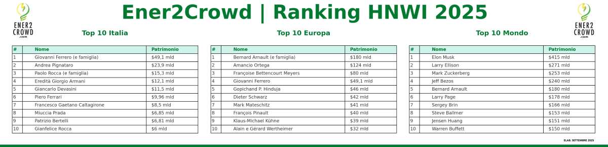Ecco dunque il Ranking HNWI 2025 di Ener2Crowd, diviso in 3 ambiti territoriali, con la top-10 Italia, Europa e mondo.